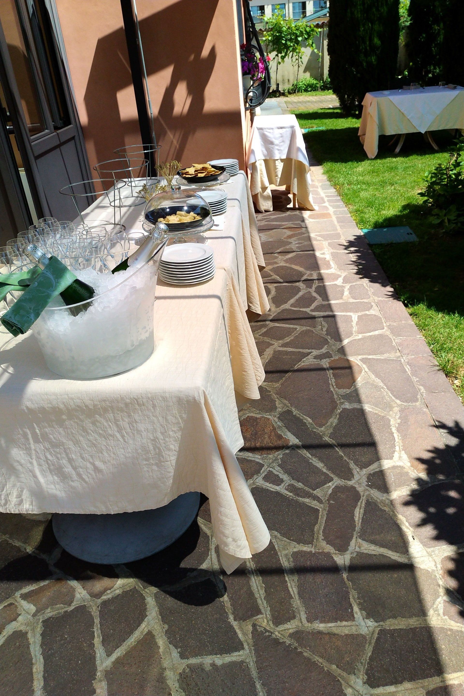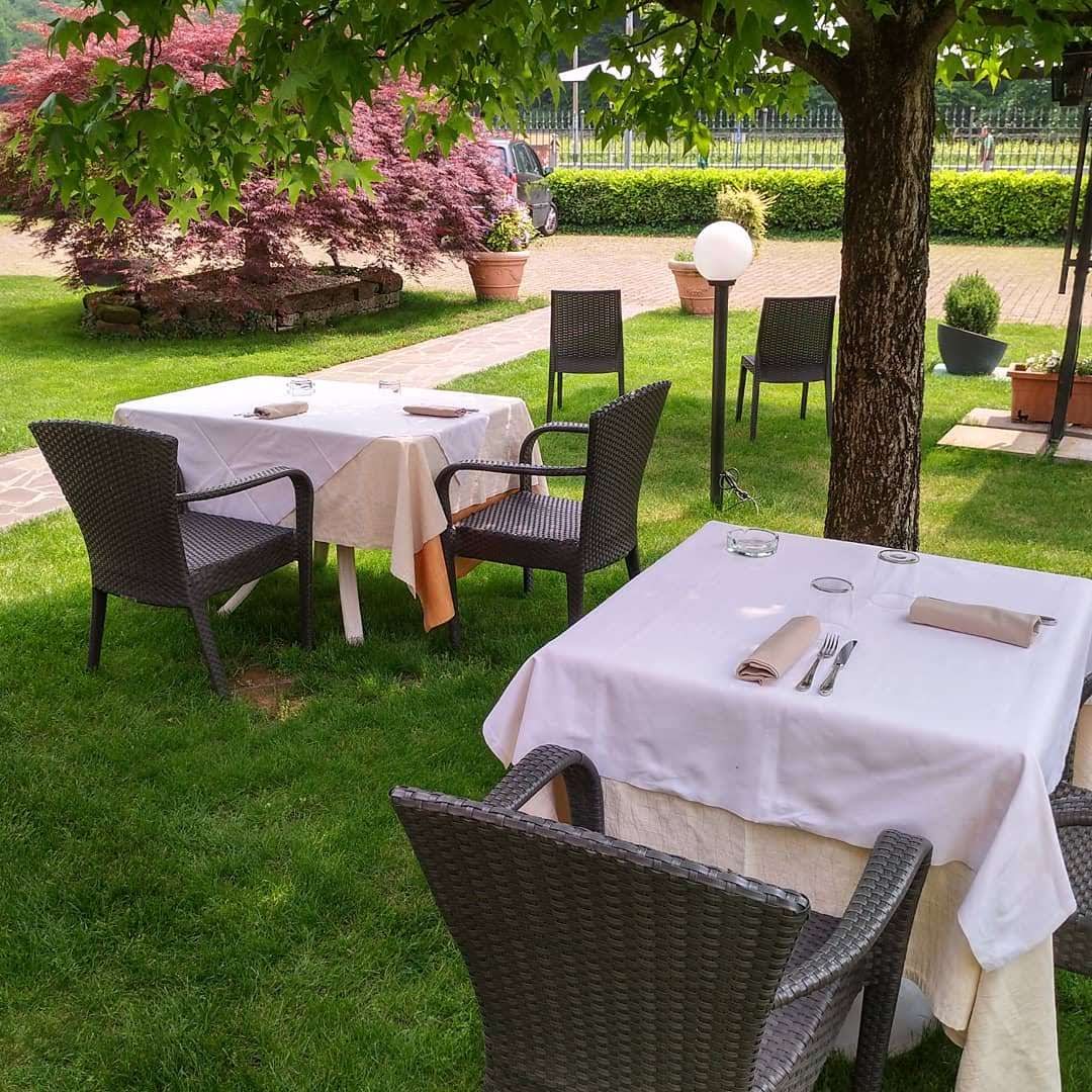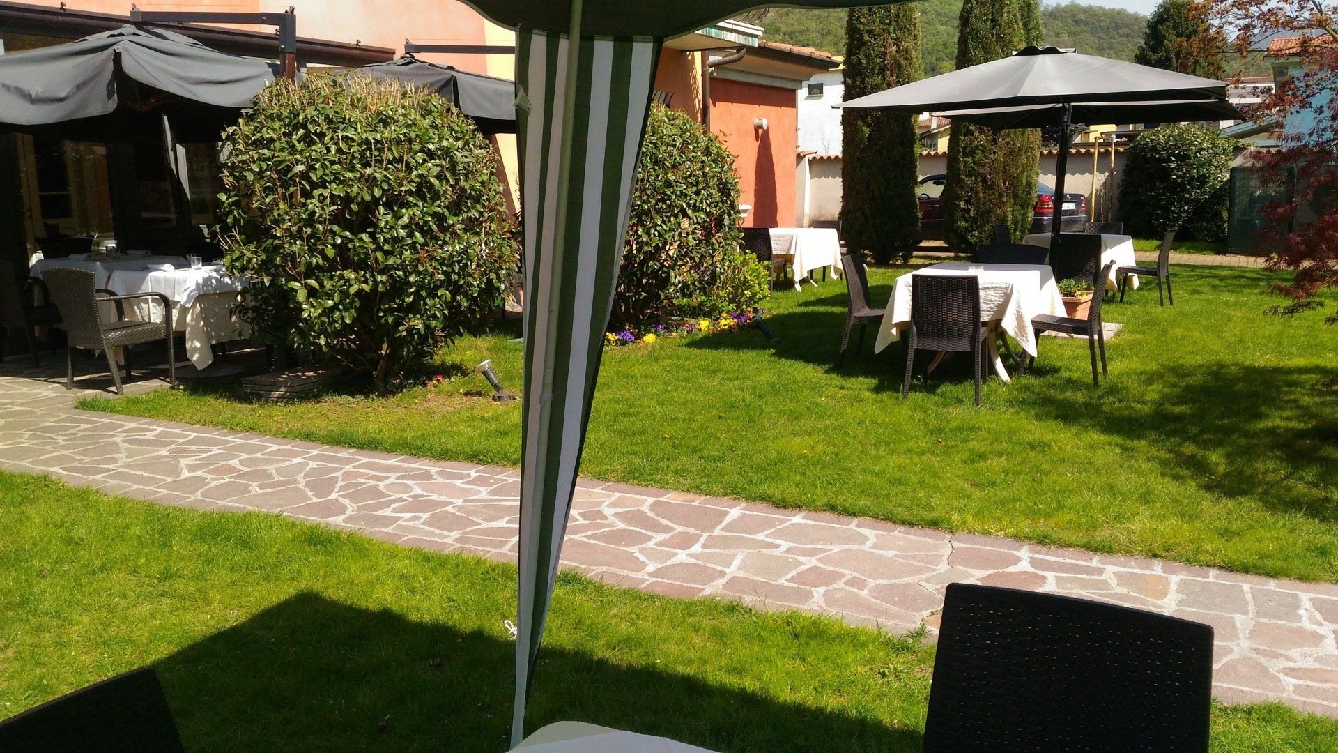 - Nel dehor esterno (ampi spazi) ospitiamo 18 persone (7 tavoli) qui ti potrai sedere direttamente in giardino, sotto gli alberi e sotto gli ombrelloni.